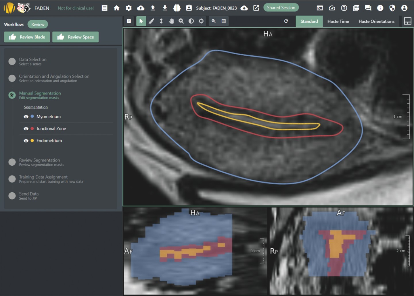 Bisher wurde noch nicht systematisch und mit moderner Technik untersucht, wie die gesunde Gebärmutter einer 12- bis 30-jährigen Frau auf einem MRT-Bild aussieht. »Durch RACOON FADEN haben wir erstmals MRT-Referenzdaten für die Gebärmutter erhalten«, stellt Prof. Dr. Sylvia Mechsner, Gynäkologin an der Charité, fest. Mit den MRT-Untersuchungen betraten die Radiologinnen und Radiologen Neuland: Im Unterschied beispielsweise zu einer CT-Aufnahme der Lunge wussten sie zu Beginn der Studie nicht, was sie segmentieren sollten. Deshalb wurden anfangs viele verschiedene Sequenzen und Bildarten aufgenommen. Dabei zeigte sich, dass der Uterus schon während der rund 40-minütigen Untersuchung im MRT sehr unterschiedliche Formen annehmen kann und auch nicht gleichmäßig im Körper liegt. Doktorandin Tappermann hat daraufhin CuraMate so angepasst, dass die Ärztinnen und Ärzte das dreidimensionale Bild noch vor der Annotation so drehen konnten, dass die Achse des Uterus zur Bildachse wurde. Durch die Anpassung der Uterusachsen auf allen Aufnahmen der Studie wurden die Segmentierungen vergleichbar.