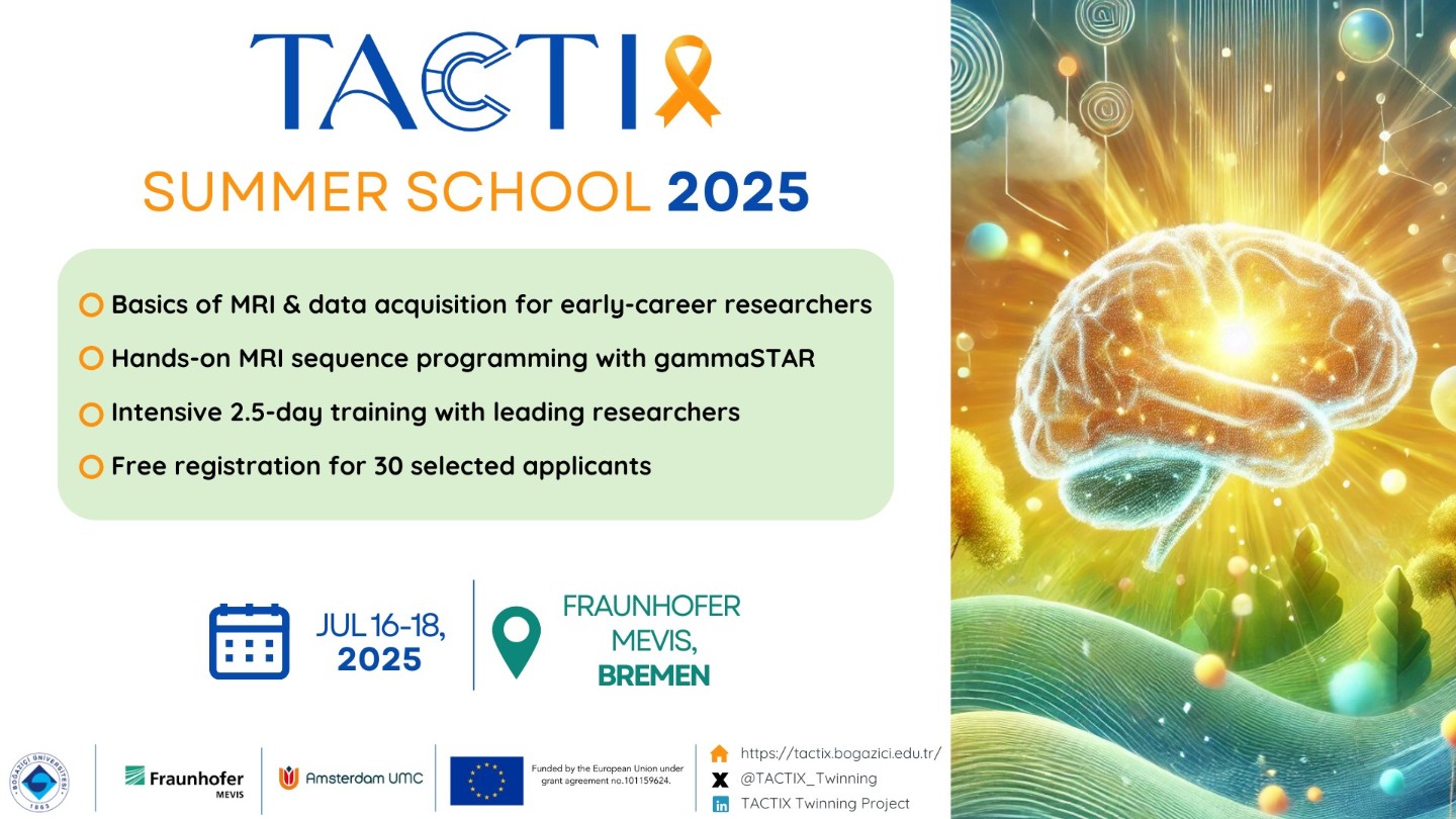 TACTIX - Twinning Approach for Computational MRI Technology and Innovation Excellence in Türkiye is a EU-funded project (grant no 101159624) that aims to enhance the scientific excellence and innovation at Boğaziçi University in the field of computational magnetic resonance imaging (MRI).