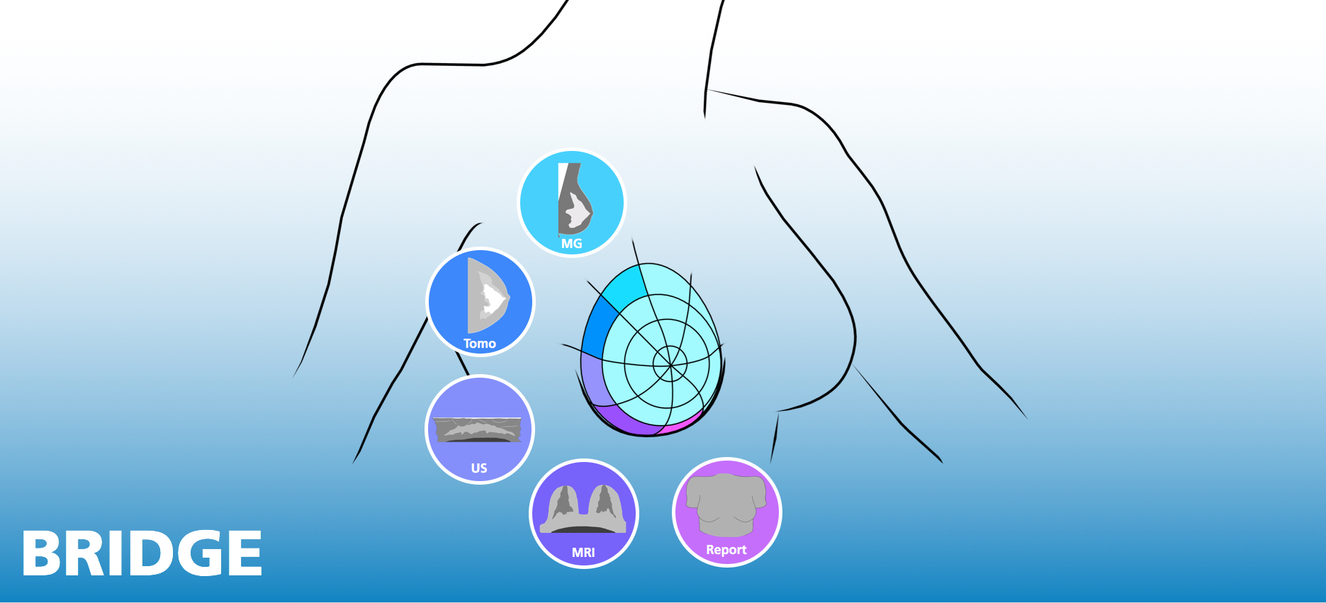 Our software solution BRIDGE automatically maps breast images into a common simulted breast model. This allows us to describe image positions relative to important anatomical landmarks and patient positioning intead of arbitrary voxel positions. Our solution is based on sophisticated compression simulations of a finite element breast model to account for the nonlinear deformation of the breast tissue. The breast model is the basis for a position correlation between images and between the image world and the report world.